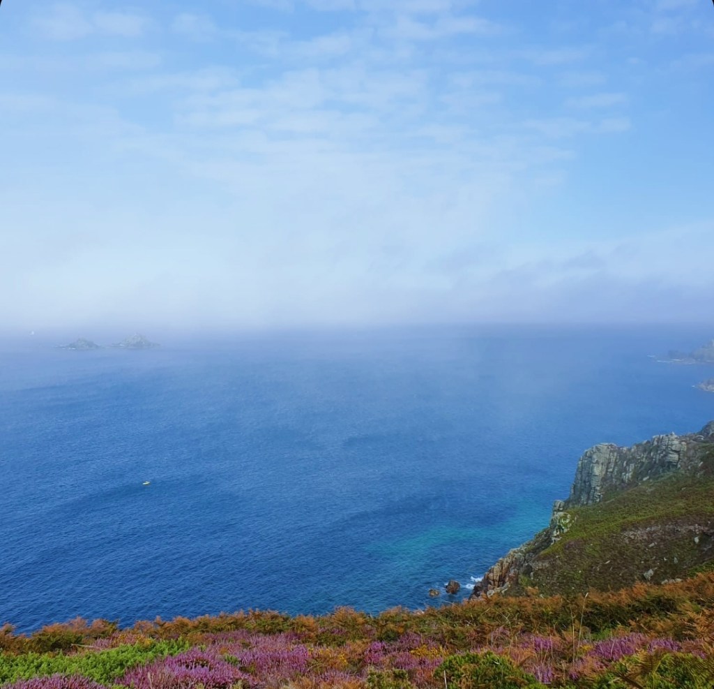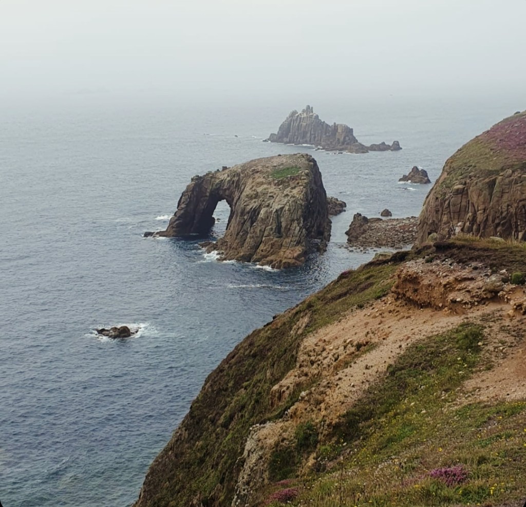 Der nächste Abschnitt des Weges verlief auf etwas leichterem Terrain, und selbst als es steiler wurde, kamen wir gut voran. Bald erreichten wir Land’s End, einen wichtigen Meilenstein auf unserer Wanderung. Leider hatte sich das Wetter geändert, und ein dichter Nebel hüllte die gesamte Küste ein, so dass wir kaum mehr als die nächste Bucht sehen konnten. Die Aussicht muss überwältigend sein, wenn die Sonne scheint, alles in warmes Licht taucht und das Meer im Sonnenlicht glitzert. Wir verließen Land’s End schnell wieder, da uns diese Touristenattraktion nach unserem friedlichen Marsch zu überlaufen vorkam. Danach wurde es schnell wieder ruhig, und wir waren wieder eins mit der Natur.