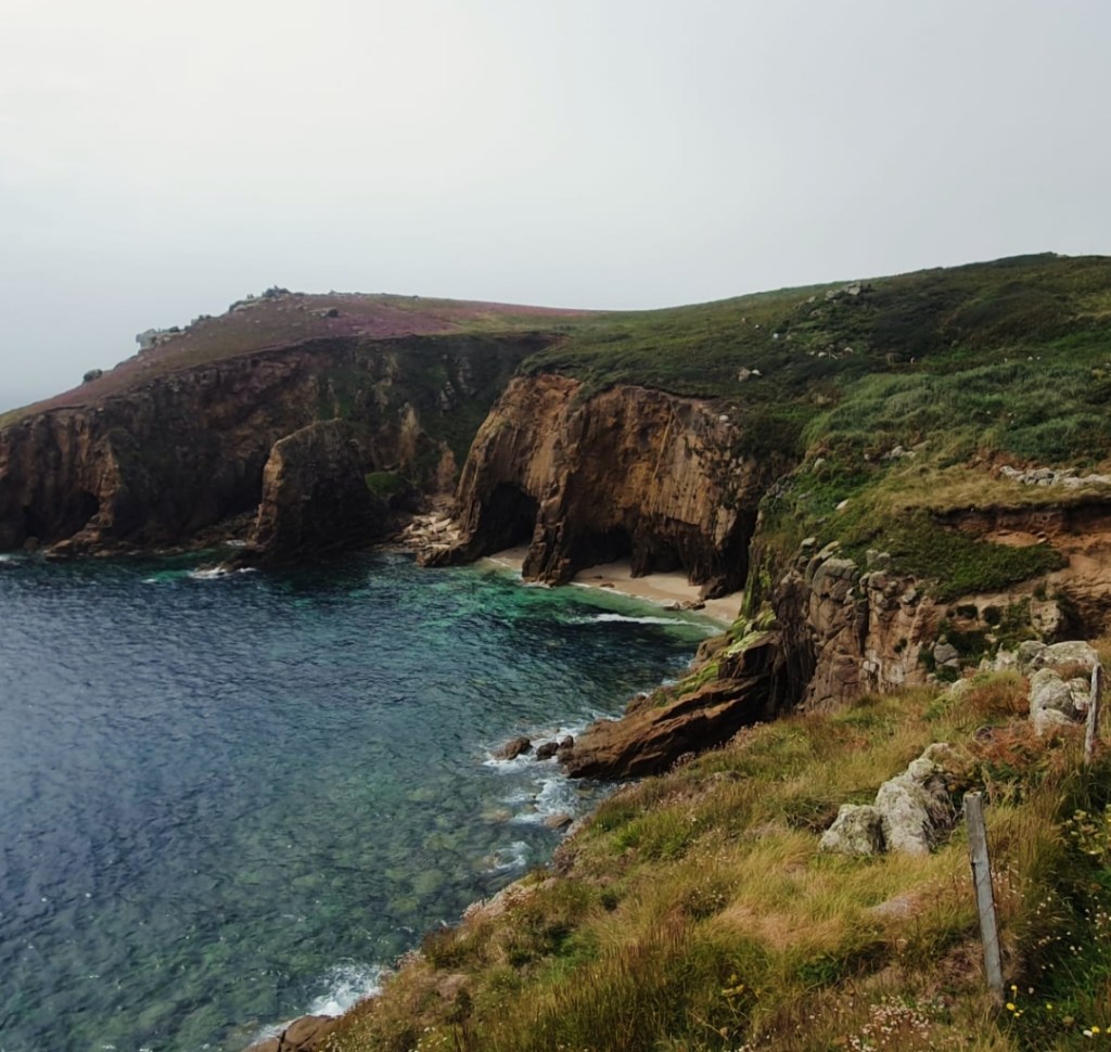 Der Weg schmiegte sich eng an den Rand der Klippe und stieg allmählich höher und höher, während die Weite des Meeres ein ständiger Begleiter blieb. Trotz des brennenden Gefühls in den Beinen und der Anstrengung bei jedem Atemzug gingen wir weiter und begegneten unterwegs nur wenigen anderen Wanderern. Gelegentlich wurden die anspruchsvollen Abschnitte des Weges von flachen, mit lila Heidekraut bewachsenen Wiesen abgelöst, und wir konnten die Aussicht auf die zahlreichen Buchten genießen. Nach etwa 8 km machten wir in Sennen Cove im gemütlichen Sennen Cove Cafe zum ersten Mal Halt. Es tat so gut, den Rucksack von den schmerzenden Schultern zu nehmen, sich hinzusetzen und die schweren Wanderschuhe für einen Moment auszuziehen, um die Füße trocknen zu lassen. Das Essen war himmlisch nach der morgendlichen Wanderung, und wir mussten uns fast aus dem Cafe rollen, weil wir so gut gegessen hatten. Aber wir waren noch nicht fertig für den Tag, und so machten wir uns pünktlich wieder auf den Weg. Wir hatten noch einige Kilometer vor uns, und wir hatten schon viel Zeit auf dem Weg verstreichen lassen.