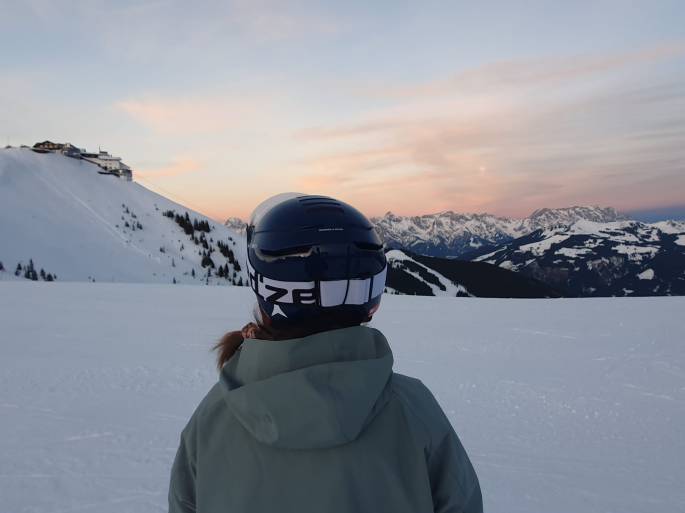 Nachdem wir uns einen wohlverdienten Germknödel mit Vanillesoße gegönnt hatten, gingen wir zurück auf die Piste. Wir hatten genug von der “Anfängerpiste” und wollten ein paar andere blaue Pisten ausprobieren. Leider haben wir die Schilder nicht richtig gelesen und sind versehentlich auf einer roten Piste gelandet, die viel steiler war als alles, was wir bisher gefahren sind. Ich hatte das Gefühl, dass meine ‘Pizza’ dort nicht mehr ausreichte, und ich stürzte mehrere Male hintereinander und rutschte einfach auf dem Rücken den Berg hinunter. Das hat mein Ego wirklich angekratzt, und ich brauchte danach einige Zeit, bevor ich bereit war, weiterzumachen. Danach lief es viel besser, aber ich hatte immer noch großen Respekt vor der Geschwindigkeit, und ich muss noch mehr üben, bevor ich die Angst abschütteln kann und mich wohlfühle, schneller zu fahren. Die letzte Abfahrt, die wir gemacht haben, war eigentlich die schönste, denn die Sonne ging langsam unter, und die Aussicht war herrlich. Diese Piste war nicht so steil und verlief vollkommen gerade, so dass wir etwas schneller fahren konnten, ohne Gefahr zu laufen, mit irgendetwas oder irgendjemandem zusammenzustoßen. Danach kehrten wir in der Hütte ein, um etwas zu trinken und zu essen, genossen den Sonnenuntergang und fuhren dann erschöpft, aber glücklich mit dem Lift zurück zur Talstation.