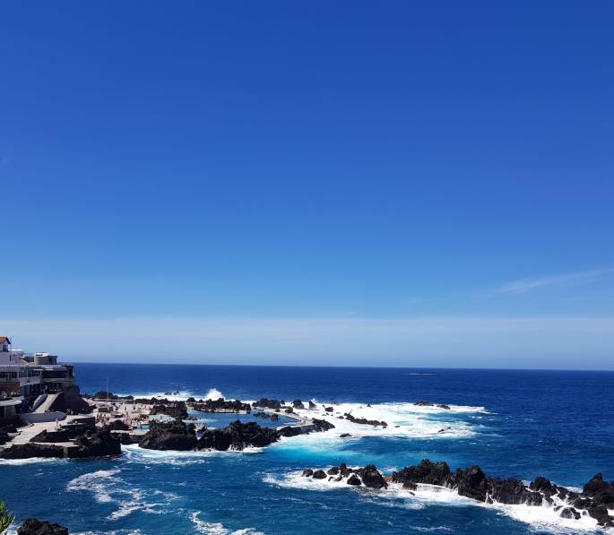 The pool in the picture is located in Porto Moniz and I would highly recommend it. You pay only 4€ for the whole day, and apparently, there’s also a beach bar open in the summer. During our visit, the water was deep blue and crystal clear—a welcome way to cool down. The waves were particularly high that day and crashed forcefully against the edges of the pools, which provided us with great fun. However, it’s important to be cautious on such days and not to lie too close to the edge of the pool, as the waves can push water over the edge, causing many people, along with their towels, to unintentionally take a dip.