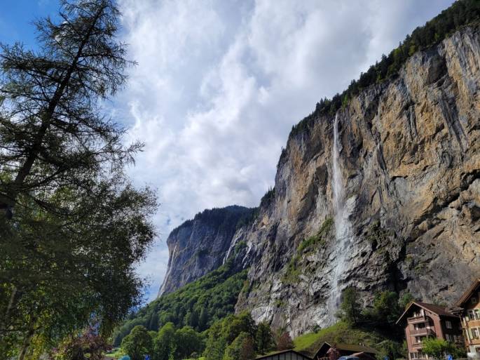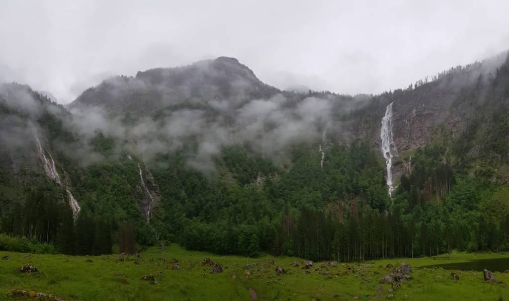 Der Weg zum Wasserfall führt durch das Tal umringt von felsigen Bergen, die steil in den Himmel ragen. Bei meinem Besuch hingen die Wolken tief in den Tannen und mehrere Wasserfälle rauschten an den steinigen Felswänden hinab, wodurch der Anblick für mich noch beeindruckender wurde. Ich war froh meine dicken Wanderschuhe zu tragen, da der Boden nicht befestigt ist und es durch den Regen äußert schlammig wurde und sich mittlerweile einige große Pfützen gebildet hatten, die es zu überqueren gab. Jetzt im Sommer trifft man dort auf den Wiesen Weidetiere an, die sich nicht von den Besuchern aus der Ruhe lassen bringen. Trotzdem sollte man weiterhin Abstand halten und ihnen ihren Raum geben, damit sie ungestört grasen können.