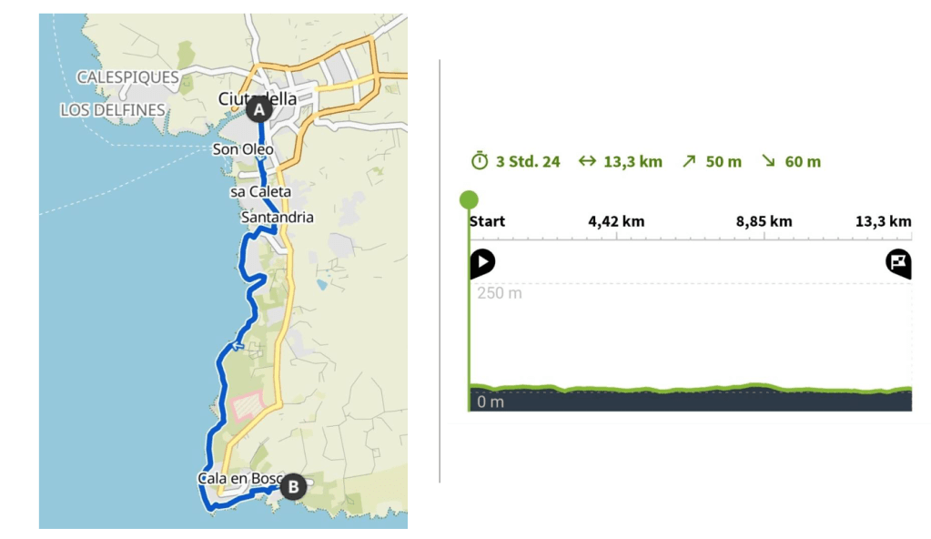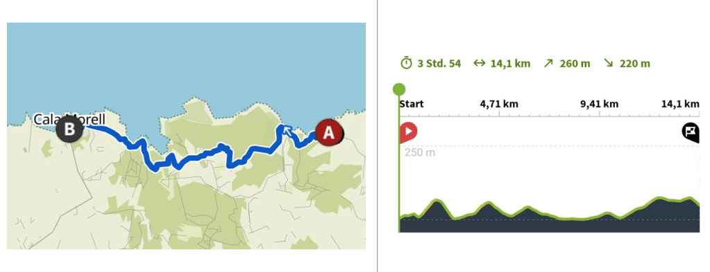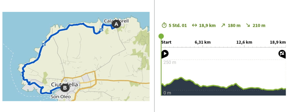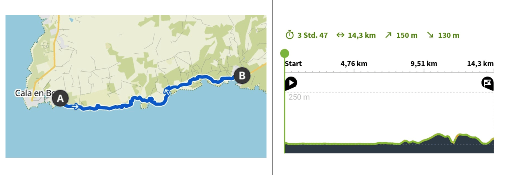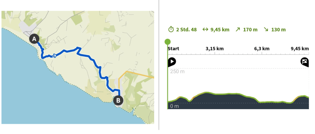 Unser Start- und Endpunkt war unser Hotel, und für die gesamte Wanderung haben wir etwa 6 Stunden gebraucht. Dabei haben wir eine längere Mittagspause eingelegt und sind auf dem Rückweg direkt am Strand entlanggelaufen. Alternativ kann man auch mit dem Bus zur gewünschten Haltestelle fahren oder mit dem Auto anreisen, um von dort aus die Wanderung zu beginnen.